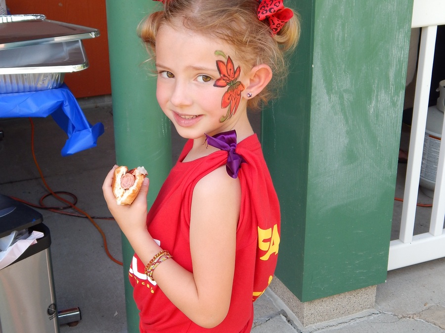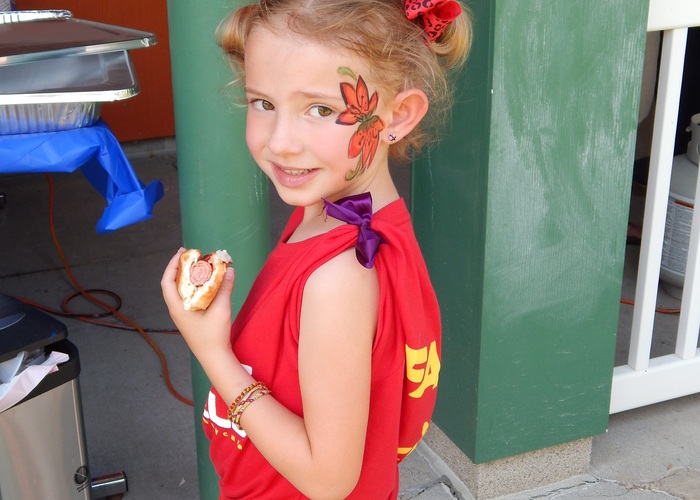 Miss Jaime's daughter shows off her flower and hotdog