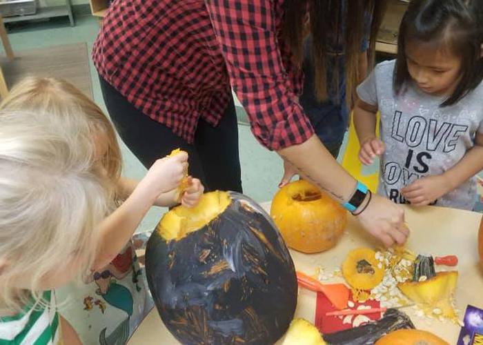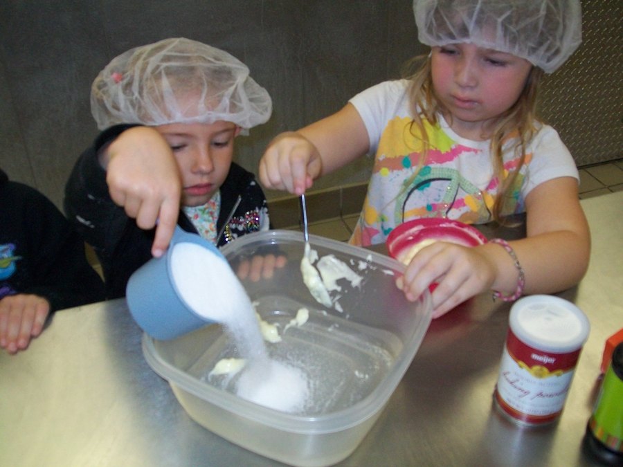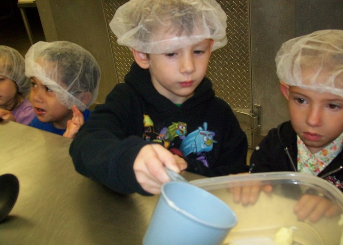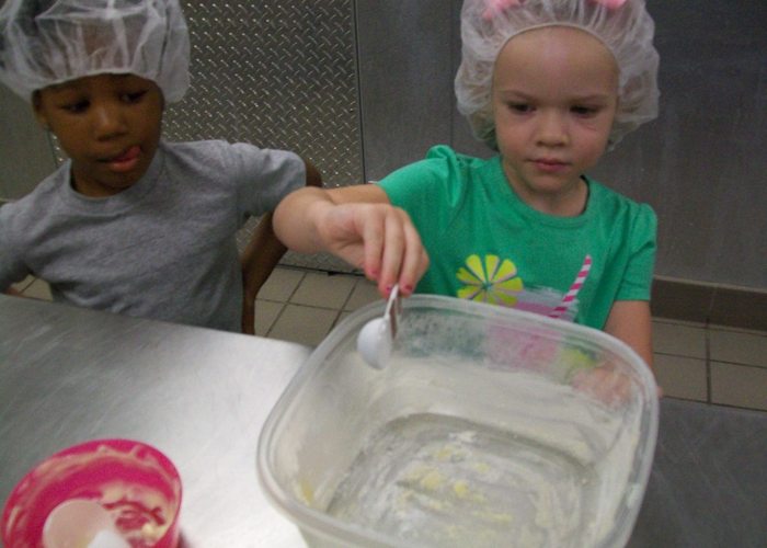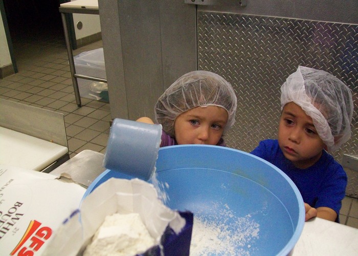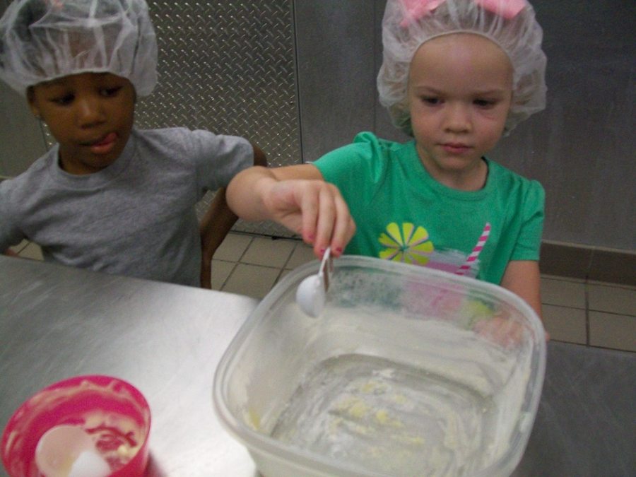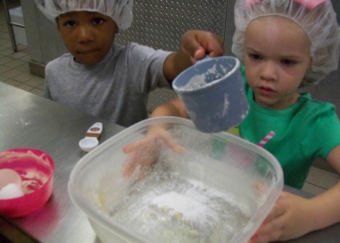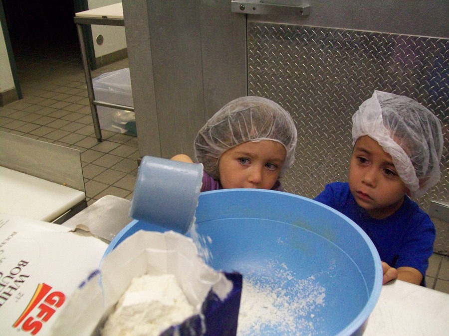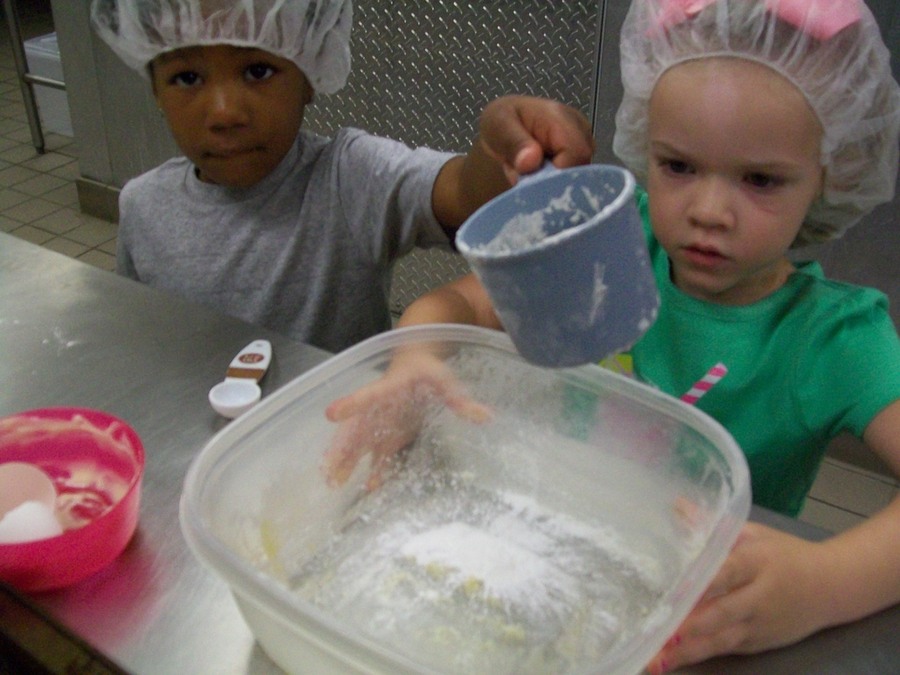 Preschoolers measure ingredients
