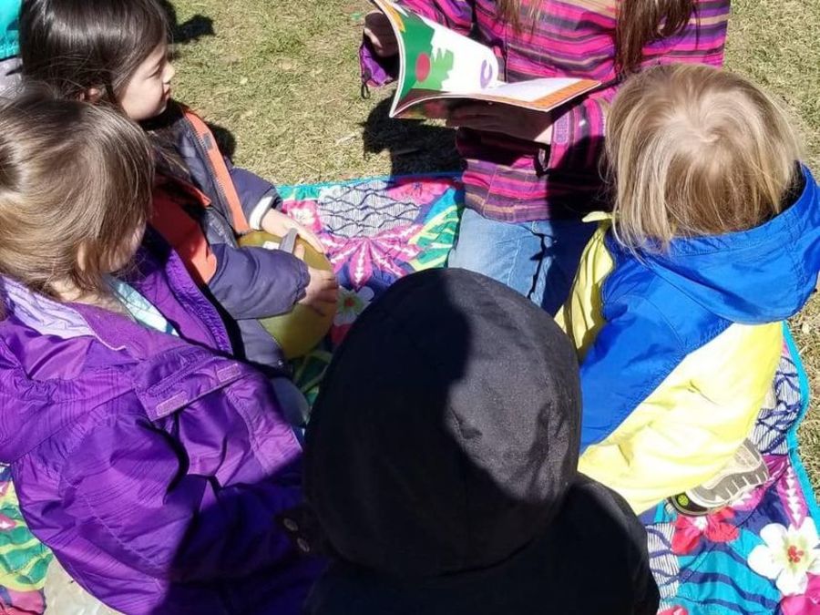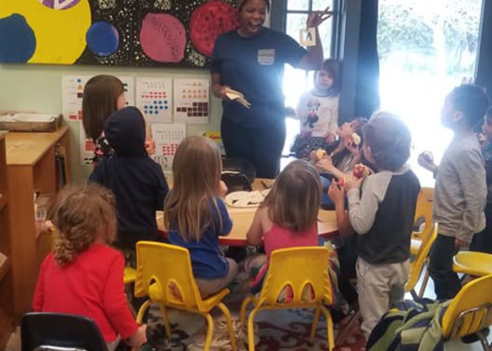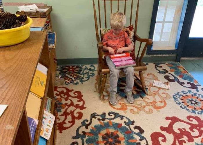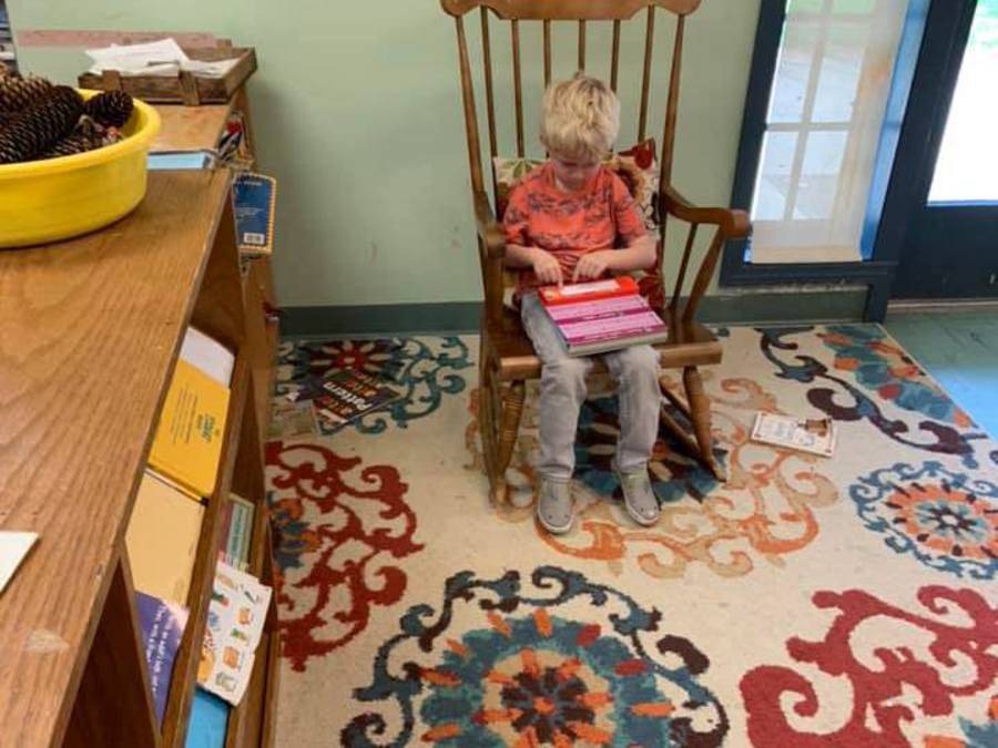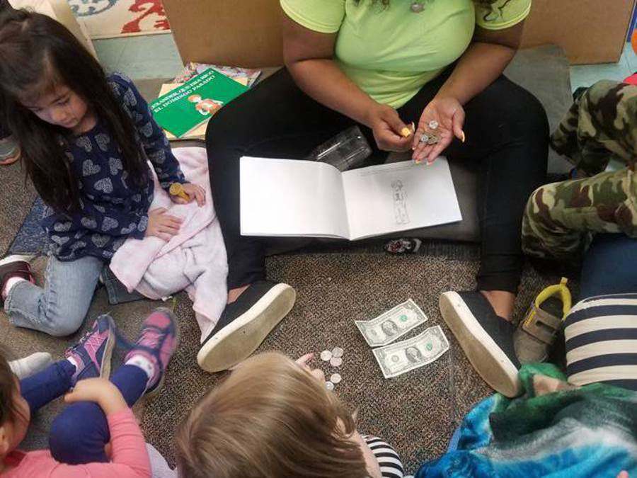 Penny reads to her class before breakfast. Even when children are creating a story based on pictures, these builds a love of books, cements reading concepts, and instills confidence.