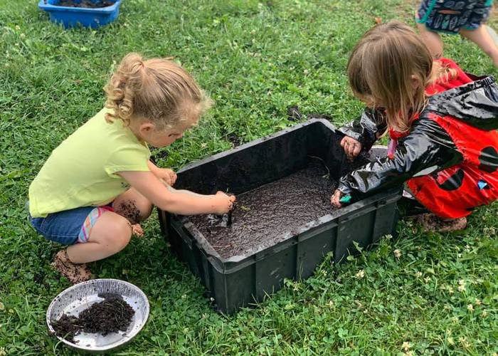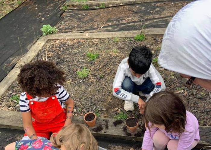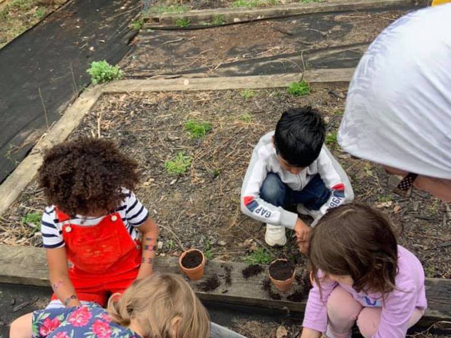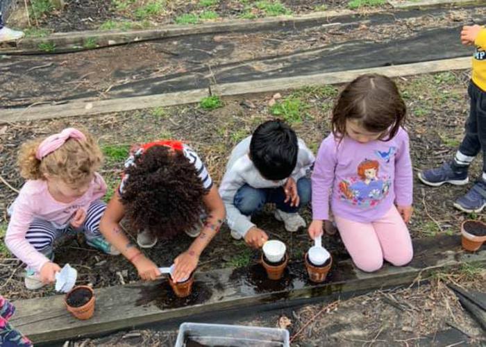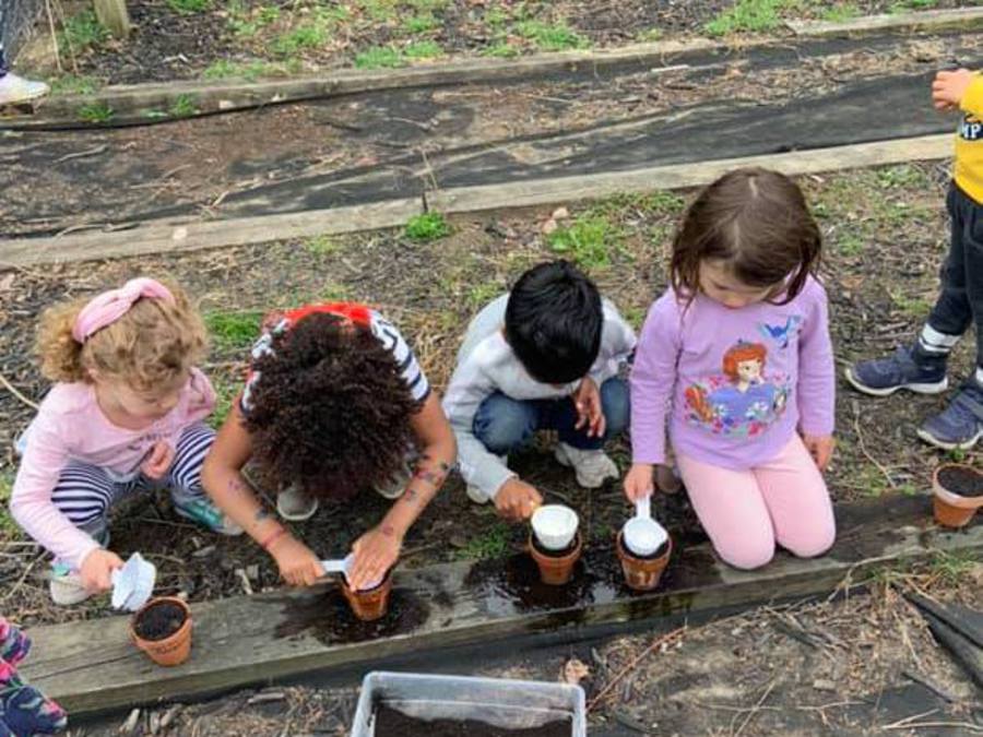 PreK works on prepping the garden.