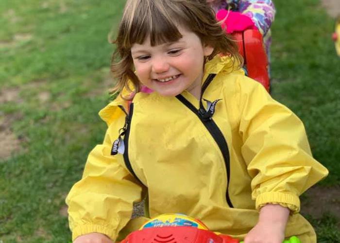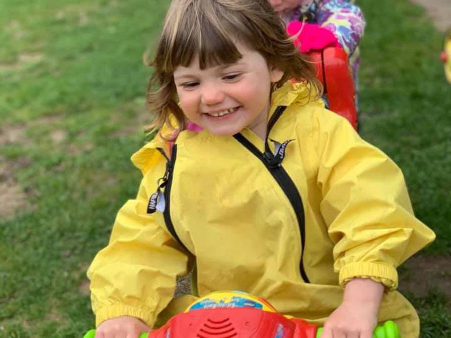Young Preschool enjoying outside in the rain on ride on toys.