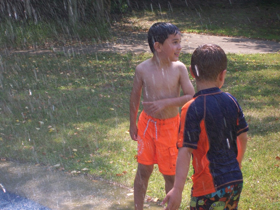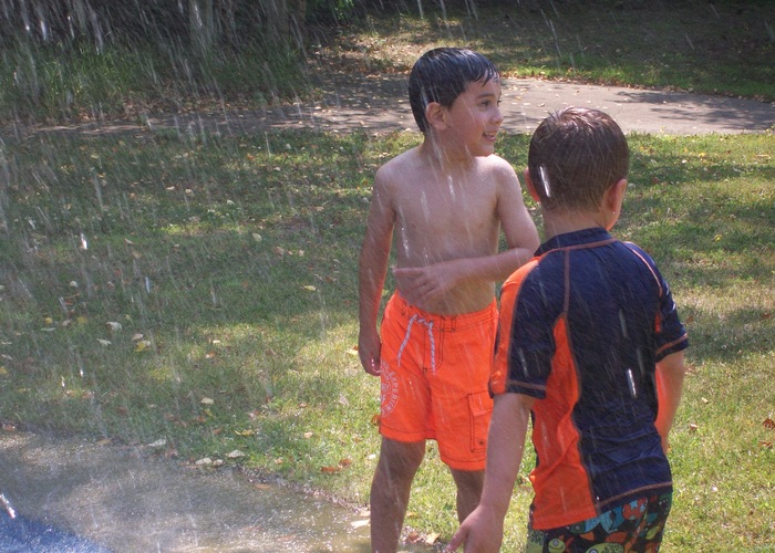 A Little Angel trying to stop the sprinkler with her foot