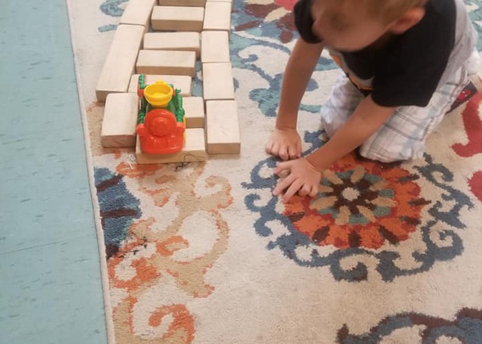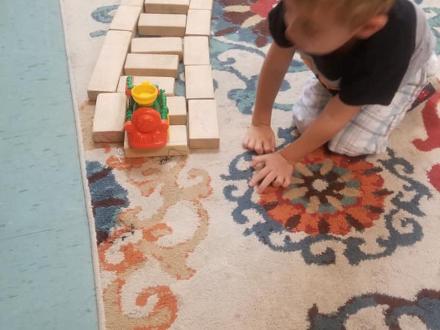 Using blocks to create a track for a train show creative thinking and problem solving.